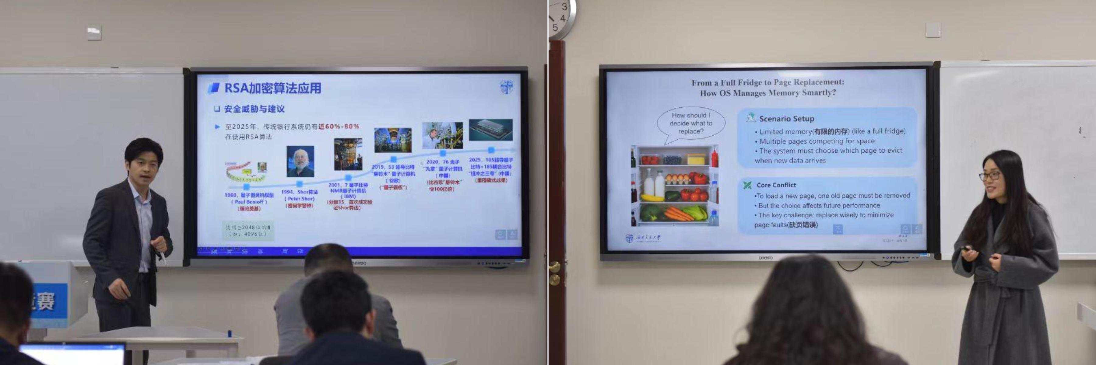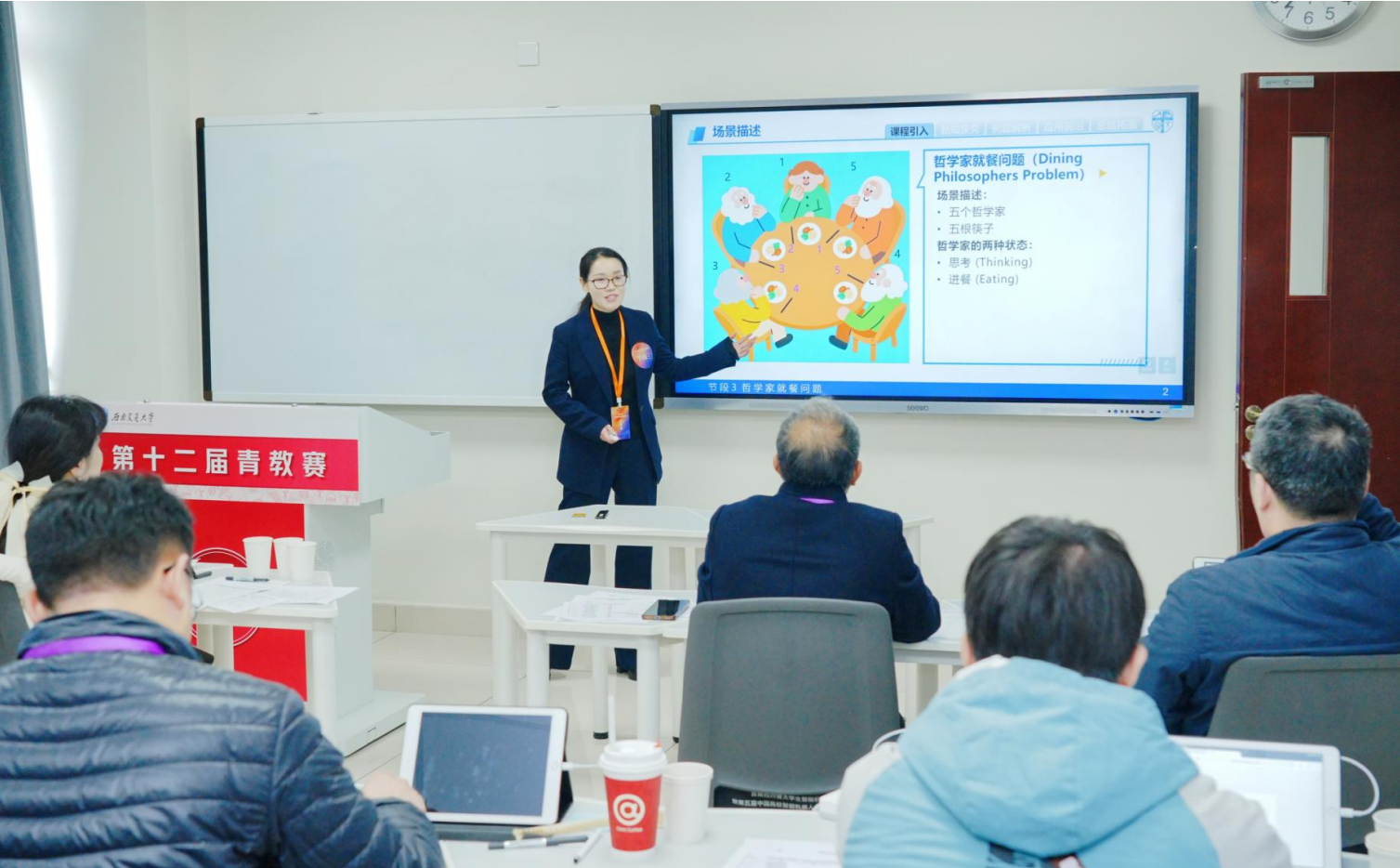 陈香伊老师以《操作系统》中的“同步机制”为主题,通过“哲学家就餐问题”这一经典案例,生动阐释并发环境下的死锁与资源竞争问题。课程运用动画演示与互动推演,系统讲解并发控制与资源调度策略,并通过实例分析展示系统死锁的解决方案。教学内容充实、案例生动、启发性强,充分体现其专业功底与教学水平,最终荣获三等奖。