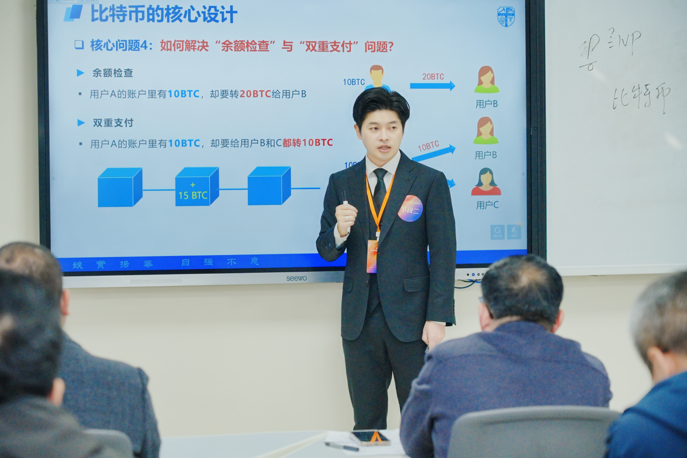 何松林老师选取《区块链技术及应用》中的“比特币核心设计”进行教学展示。通过对比中心化与去中心化交易模式,系统解析比特币的核心机制,从交易验证到共识算法,层层深入阐释分布式记账关键问题的解决方案。课堂上运用“第一性原理”启发学生独立思考,课程逻辑严密、节奏得当,充分展现其专业素养与教学能力,最终荣获二等奖。