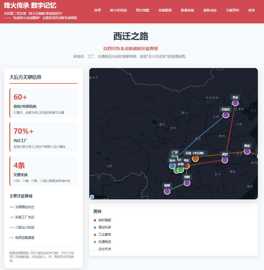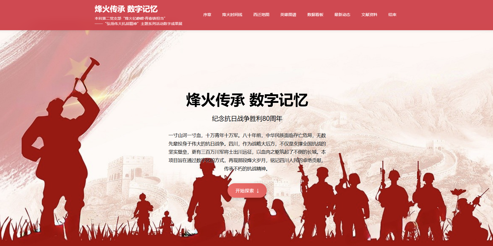 在数字化浪潮席卷的今天,为进一步让厚重的抗战历史突破时空限制,走进青年学子的生活,更好传承红色基因,支部党员发挥计算机专业优势,精心打造、上线“烽火传承·数字记忆”抗战精神数字展厅。数字展厅以 “数字化呈现、互动式体验、立体化传播” 为核心特色,不仅整合了抗战历史文献、英烈事迹、红色影像等珍贵资料,还设置了 “烽火时间线”“英雄图谱” 等板块,为广大师生搭建起沉浸式了解抗战历史、感悟抗战精神、赓续红色血脉的线上阵地。数字展厅的上线,是支部对 “红色精神数字化传播”这一新时代课题的积极回应。支部书记张斯涵同志表示:“我们希望用专业所学为红色精神赋能,让冰冷的代码转化为传承红色基因的温暖载体,让伟大抗战精神以更贴近青年的方式实现代际传递”。