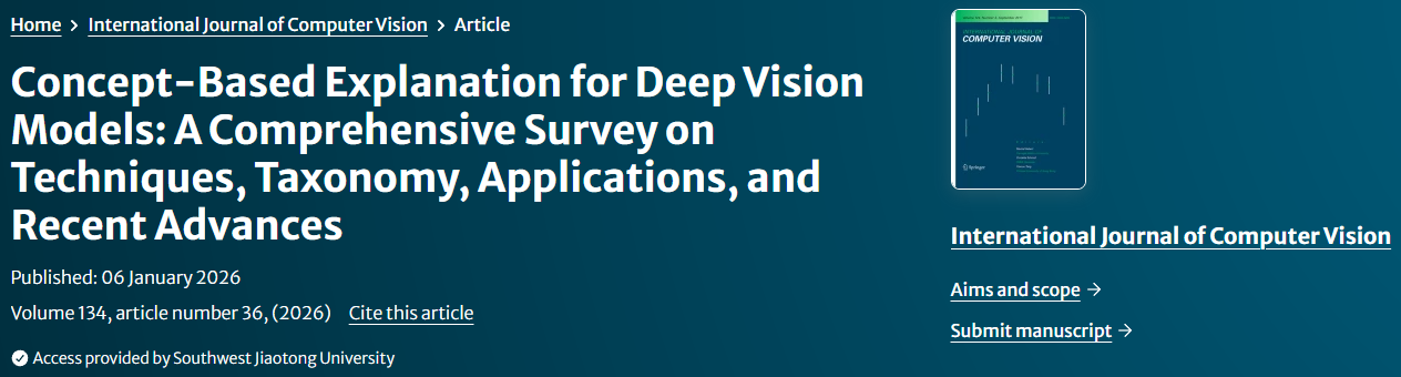近日张家树教授导师团队在国际学生培养方面取得重要成果,2026年1月6日,团队所指导的国际博士生RAZAN ALHARITH在International Journal of Computer Vision (IJCV)发表了长达44页的一篇题为《Concept-Based Explanation for Deep Vision Models: A Comprehensive Survey on Techniques, Taxonomy, Applications, and Recent Advances》综述文章。 IJCV是中国计算机学会(CCF)和中国人工智能学会(CAAI)推荐的A类期刊,也是计算机视觉领域最被认可的两大期刊之一。 2022级计算机科学与技术博士生RAZAN ALHARITH为第一作者,张家树教授为通讯作者,论文作者还包括团队青年教师吴振宇副教授,西南交通大学计算机与人工智能学院为第一单位。