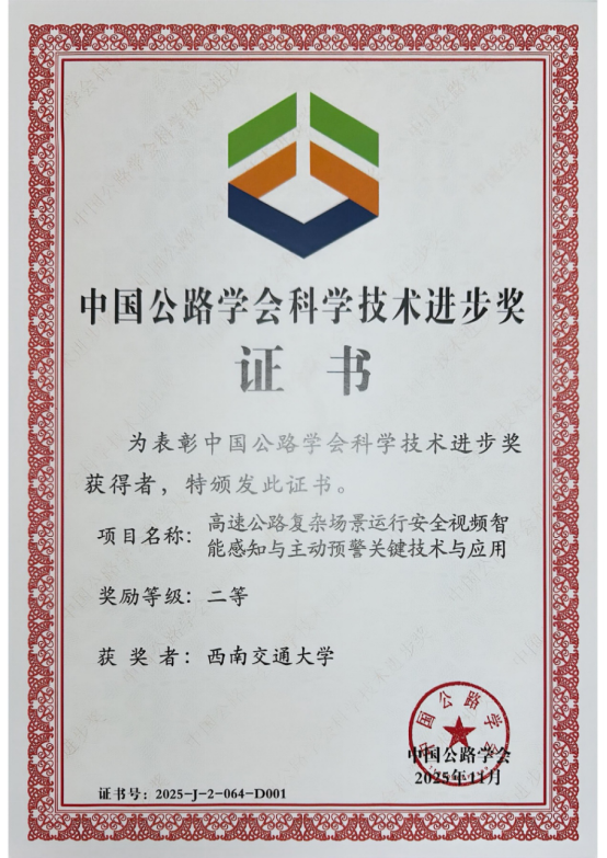 2025年度中国公路学会科学技术奖颁奖仪式于2025年12月1日在厦门举行。由我院吴晓教授牵头,联合招商局重庆交通科研设计院、广西新发展交通集团等单位共同完成的项目《高速公路复杂场景运行安全视频智能感知与主动预警关键技术与应用》获中国公路学会科学技术进步二等奖。这是可持续城市交通智能化教育部工程研究中心、数字交通智能安全川渝重点实验室以及人工智能研究院取得的又一具有显示度的成果,充分展示了我校在人工智能与智能交通交叉领域的科研实力与创新水平。