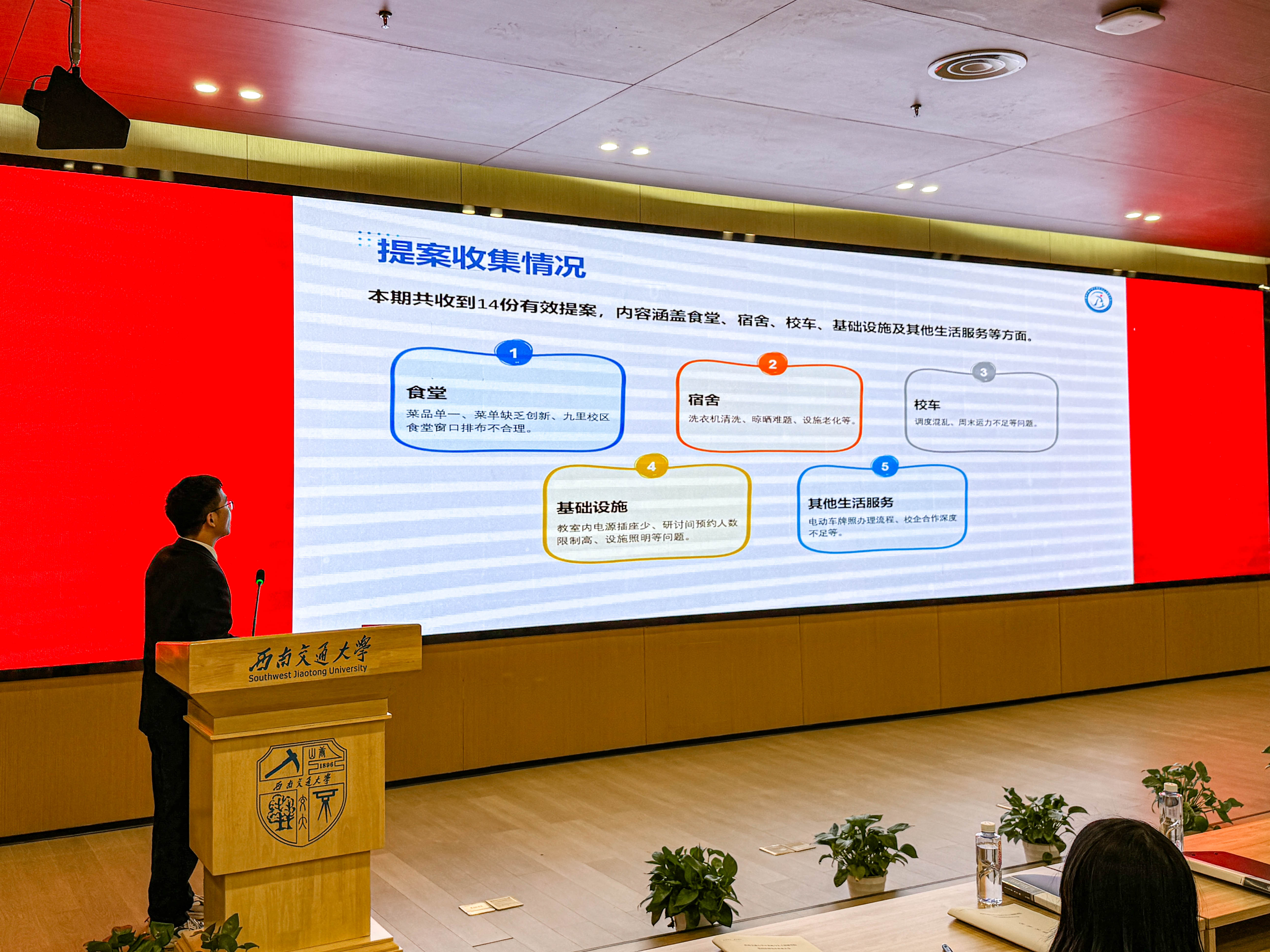 大会核心环节聚焦提案呈现、实际调查进展反馈。本次会议累计征集 14 份有效提案,内容集中覆盖基础设施、生活服务、教育教学三大核心领域。针对学生关心的内容,后勤保障部、教务处、就业指导中心等相关职能部门负责人逐项作出针对性回应,食堂服务将优化菜品丰富度与营业时间规划,满足不同时段就餐需求;宿舍设施方面,眷诚斋老旧环境及设施升级、空调与饮水机统一管理、公共洗衣机规范清洁消毒等需求已制定明确推进方案,宿舍楼自动贩卖机也将按区域分批补充投放;校车服务将进一步优化运营时间排布、评估通勤车辆增配可行性,同步研究校车通勤补贴设立事宜;基础设施领域,九里校区电动车充电桩扩容计划已启动,乒乓球场灯光增补与破损球台修缮工作即将开展;教育教学方面,将协调推进大内存服务器资源调配与开放使用,同时升级就业资源提供平台,拓宽优质岗位信息推送渠道。