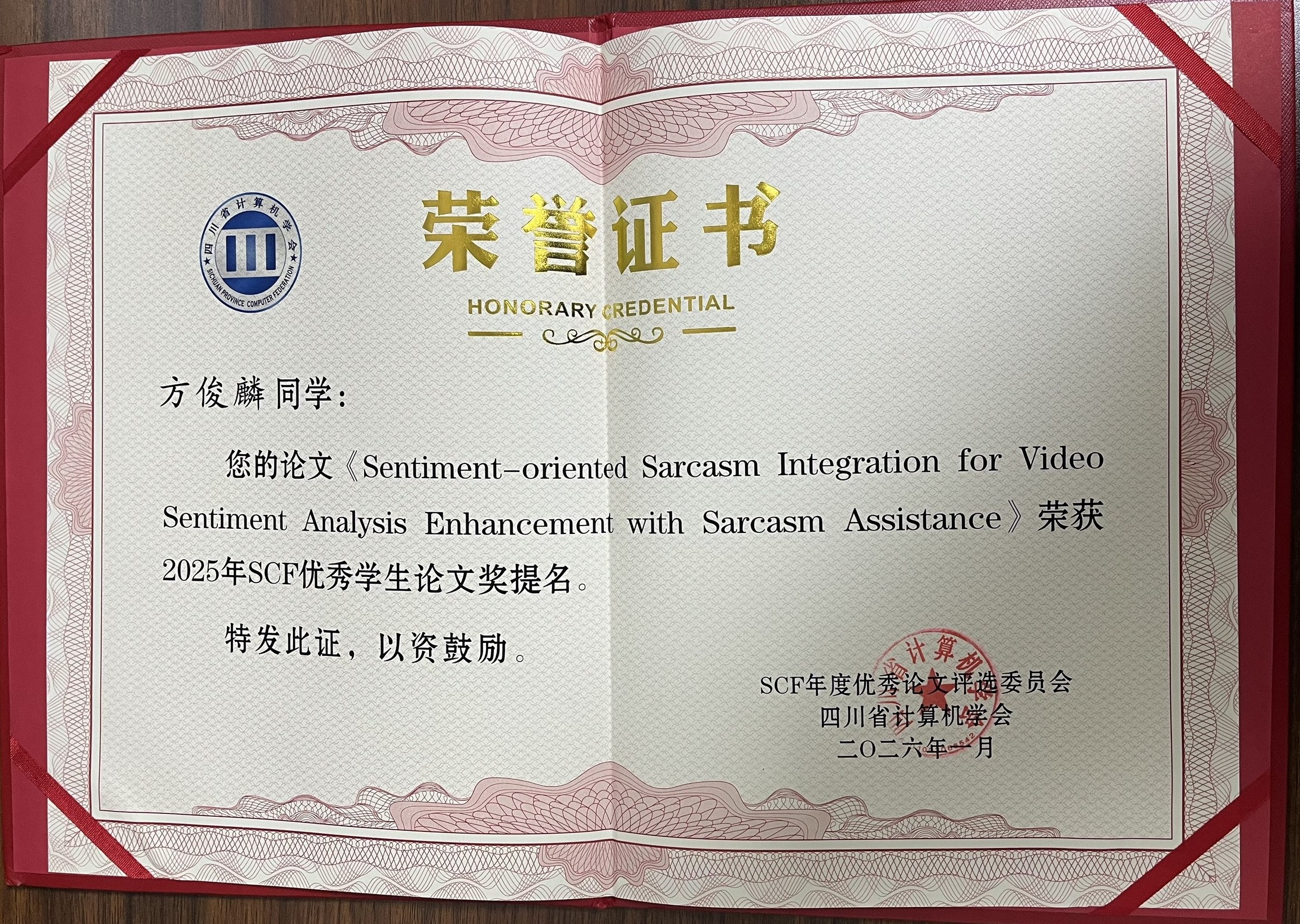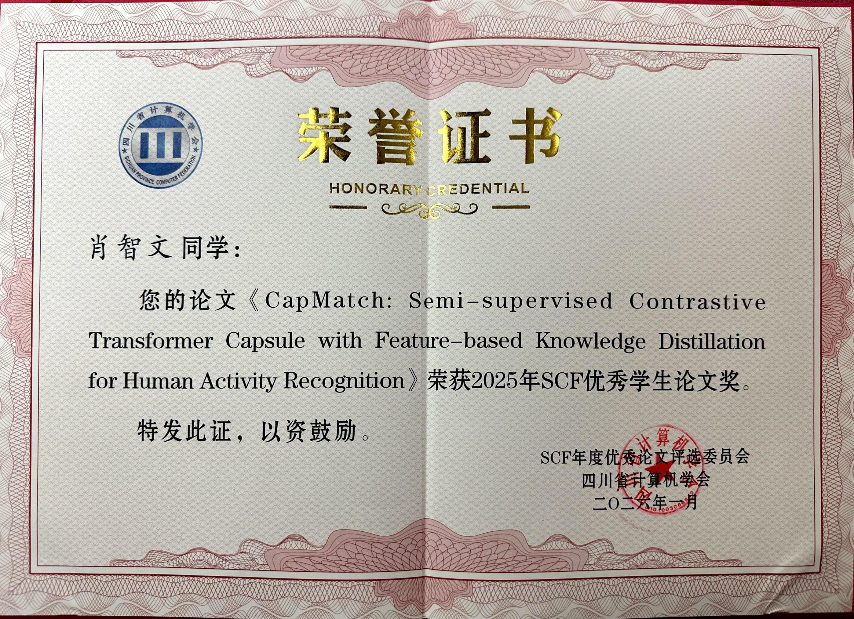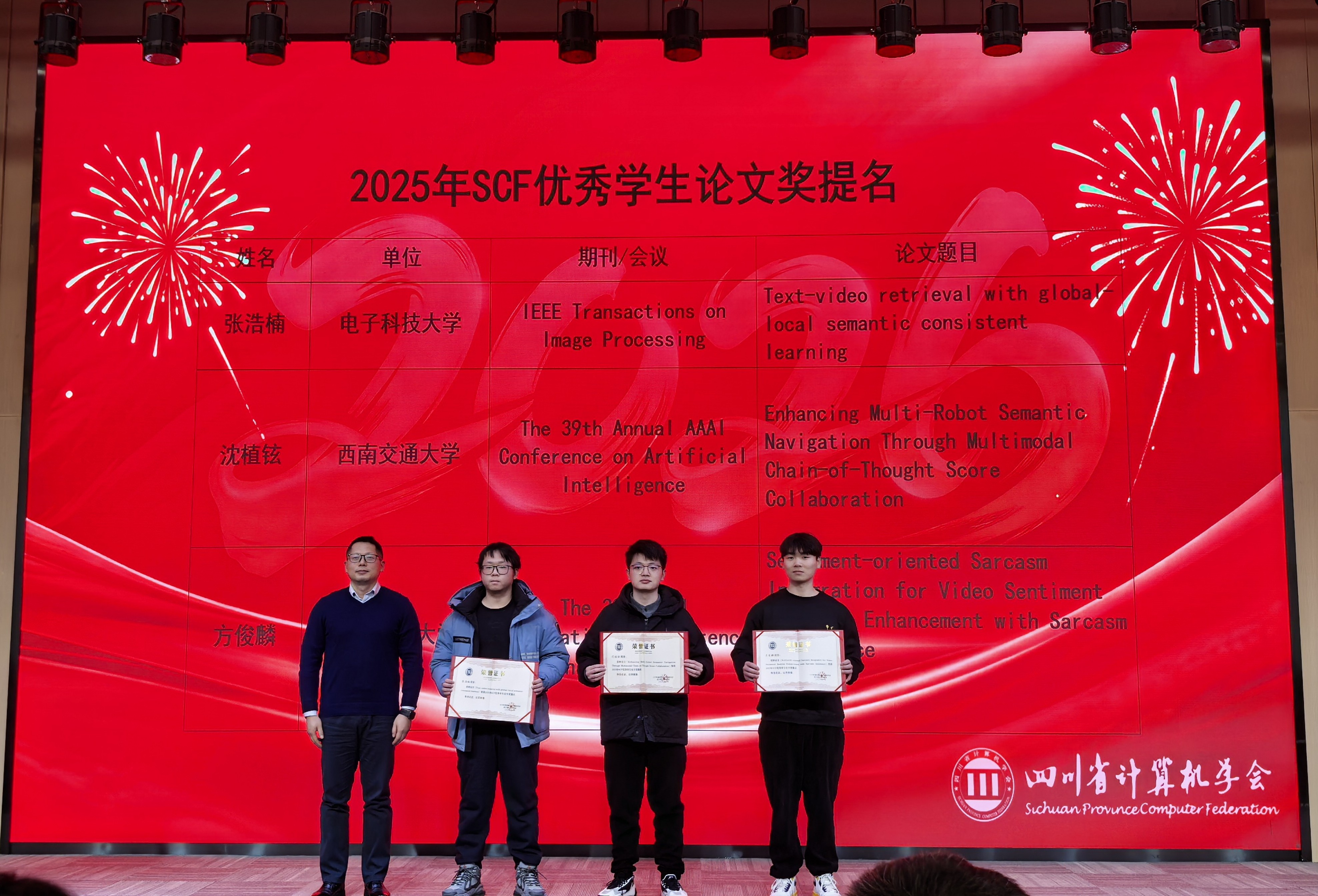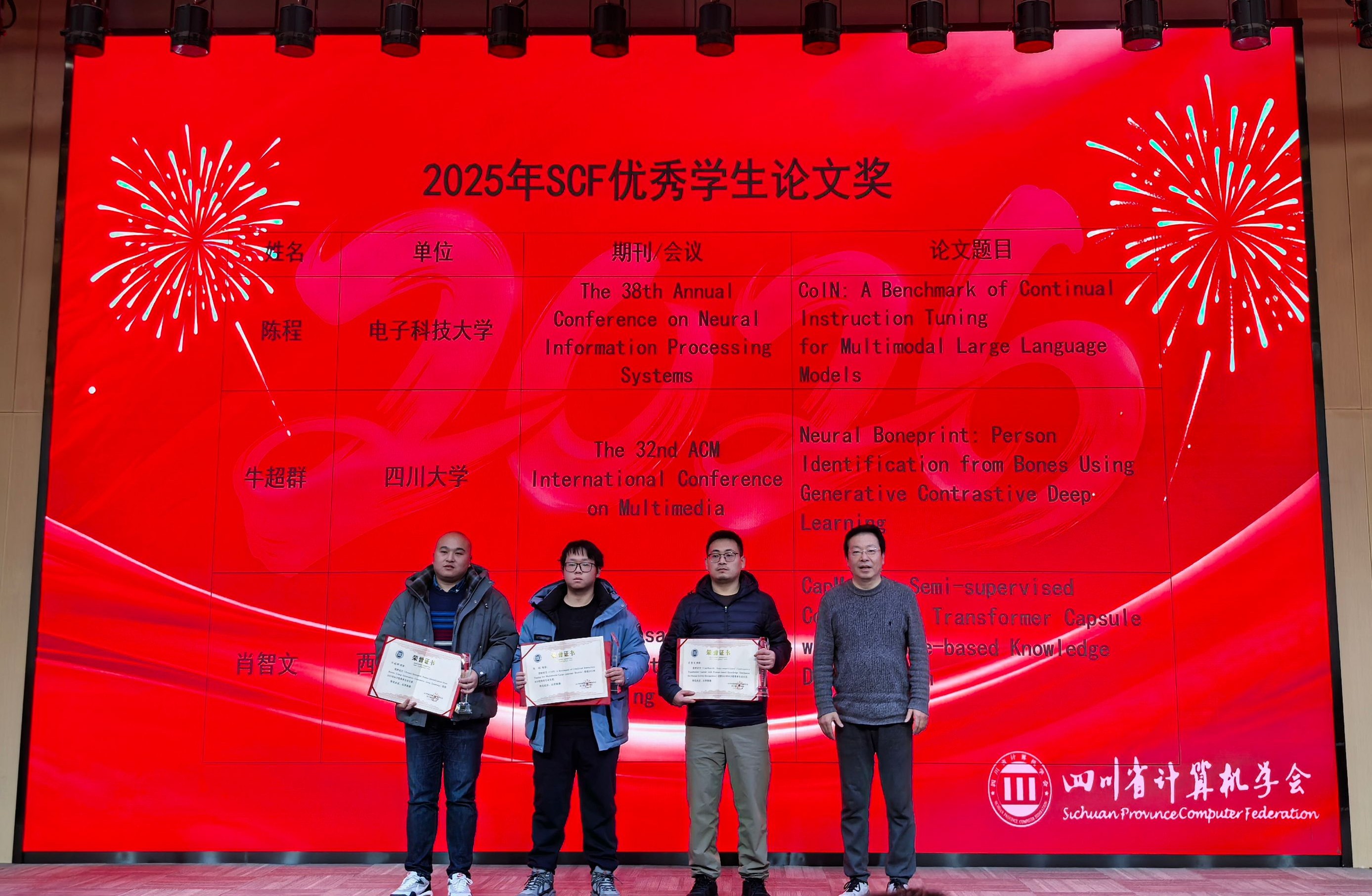 根据四川省计算机学会《SCF年度优秀学生论文评选办法》和《2025年“SCF年度优秀学生论文奖”的通知》(川计学〔2026〕2号)文件的要求。2025年度SCF年度优秀学生论文评选经过论文作者自愿申报、专家评审和SCF年度优秀学生论文评选委员会审定,我院有3位研究生获奖:博士研究生肖智文(导师:邢焕来 副教授)获“2025年SCF优秀学生论文奖”;博士研究生沈植铉(导师:李天瑞 教授)和硕士研究生方俊麟(导师:吕凤毛 副教授)获“2025年SCF优秀学生论文奖提名”。