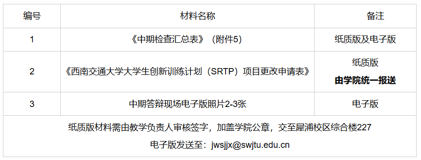 (2)2025年11月24日(第12周周一)17:00前,项目组和指导老师认真准备、充分研究后,登录“教务系统—SRTP科创—中期检查”板块提交中期检查材料。并认真填写《西南交通大学大学生创新创业训练计划(SRTP)项目中期检查表》(附件2),由指导教师签署意见后提交至计算机与人工智能学院本科教务办公室X31535。