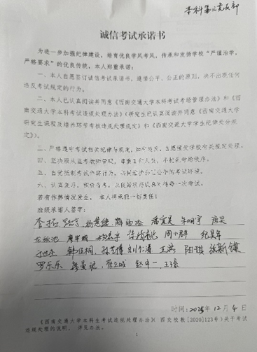 考风考纪是学风建设的重要一环,为强化纪律意识,支部书记李拓重点研读了《西南交通大学本科生考试违规处理办法》《西南交通大学本科考试考场管理办法》及《西南交通大学学生纪律处分规定》等文件。通过对违规案例的分析学习,支部成员深刻认识到了遵守考试纪律的严肃性和重要性。随后,支部全体成员郑重签署了《诚信考试承诺书》,以身作则,带头做诚信考试的践行者和宣传员。